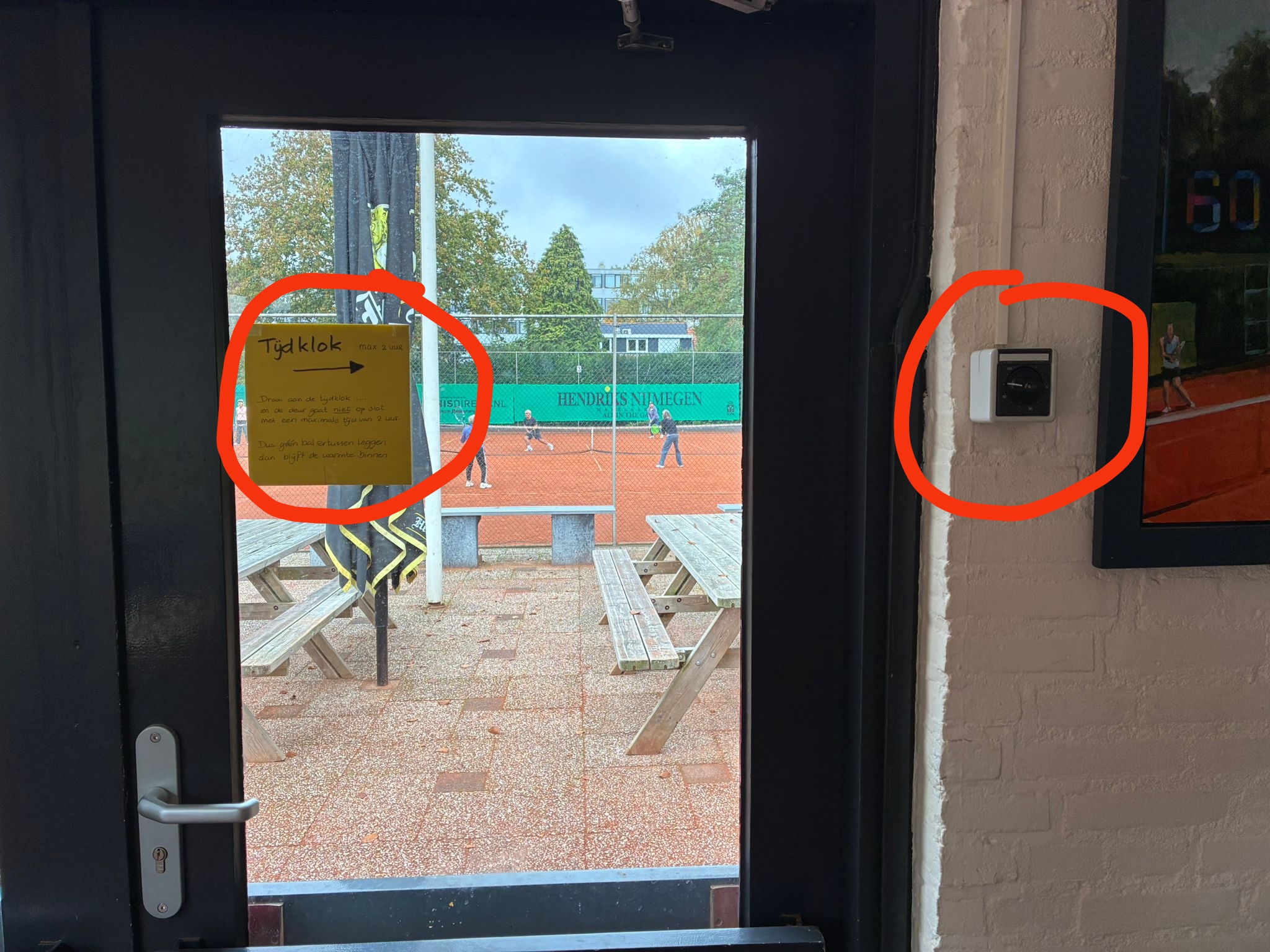In het clubhuis is rechts bij de voordeur een tijdklok (soort kookwekker) geplaatst, zie de foto. Als de tijd nog niet afgelopen is, dan zal de voordeur van buitenaf geopend kunnen worden zonder de persoonlijke code uit de KNLTB ClubApp in te hoeven toetsen. Iedereen kan de tijd verhogen tot maximaal twee uur, natuurlijk met tussentijds verlengen.