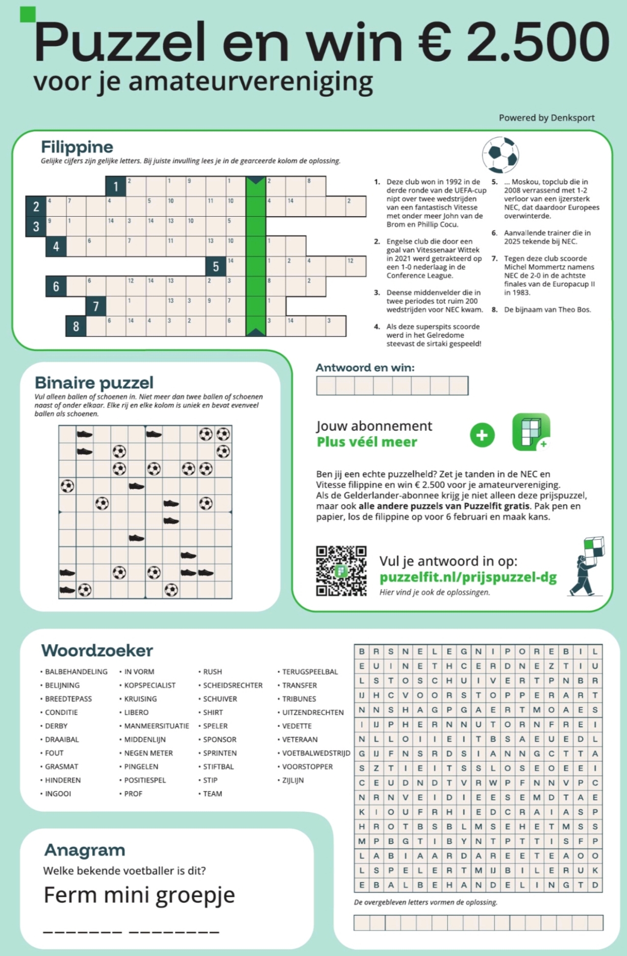 Als je de oplossing van deze puzzel instuurt en je inschrijft bij puzzelfit.nl, maakt je amateursportvereniging kans op €2500, stond vandaag in De Gelderlander. Daarom de vraag aan alle leden om de oplossing in te vullen op puzzelfit.nl/prijspuzzel-dg, zeker als je abonnee van De Gelderlander bent. Voor wie de puzzel niet zelf wil maken, kijk onderaan dit bericht voor de oplossing.